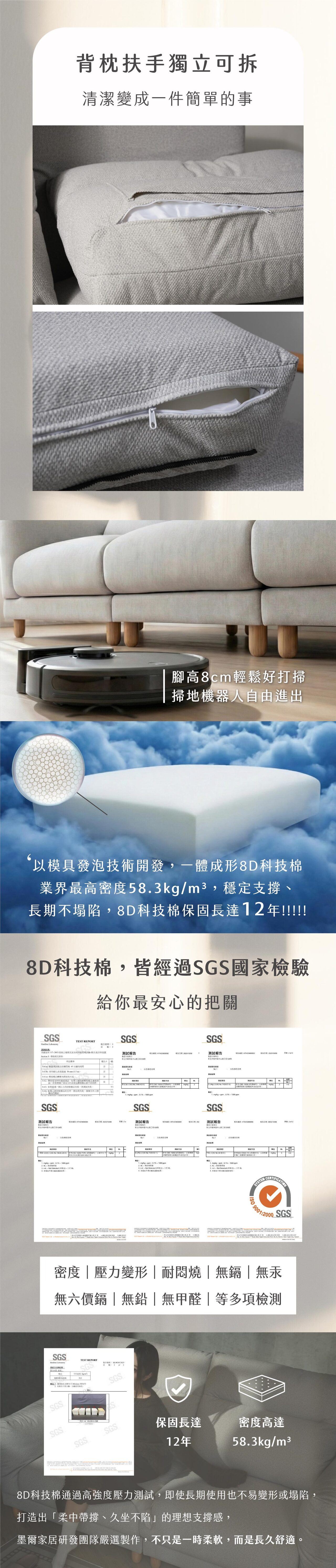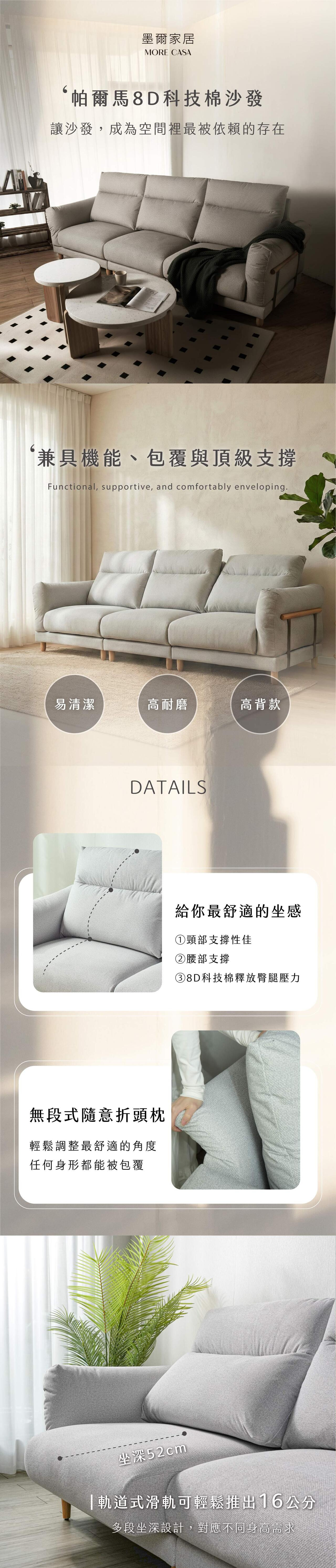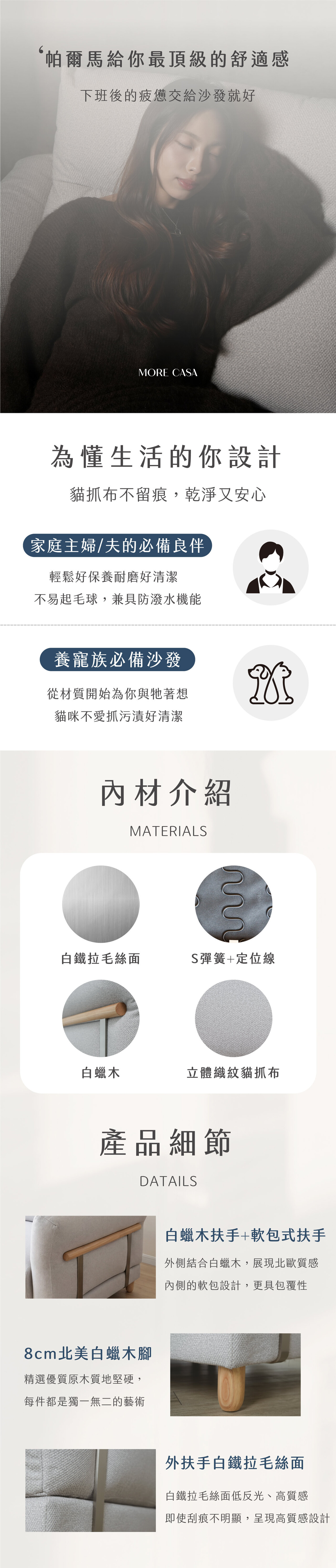 • 材質:✦獨家專利墨爾8D科技棉 密度達58.3kg/M³✦、立體織紋貓抓布、S彈簧與平衡定位線打底、羽絨棉填充極佳包覆、白蠟木外扶手、白鐵拉毛絲面