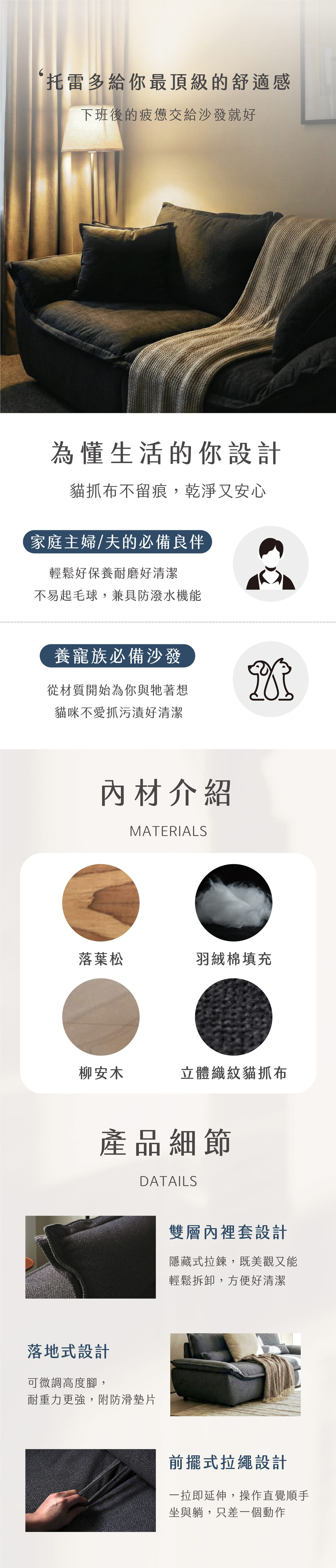 • 材質:立體織紋貓抓布、羽絨棉填充極佳包覆、S彈簧與平衡定位線打底